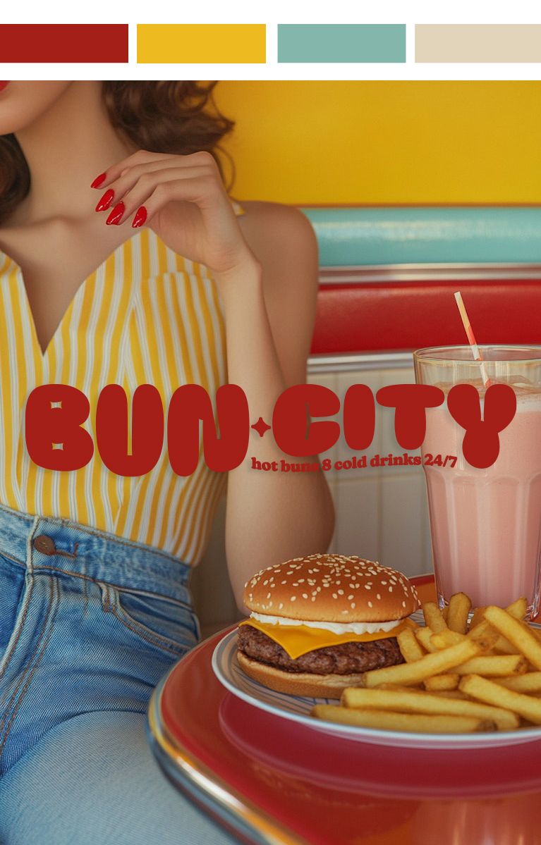 Bun City Diner's brand identity is a vibrant, nostalgic blend where iconography from the golden era of diners meets today’s craving for fun, flavor, and timeless charm.